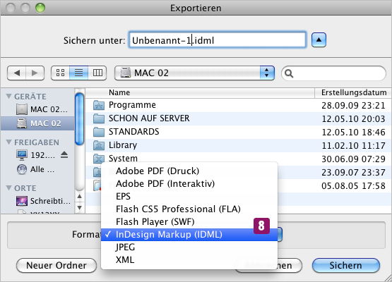 In CS5 erfolgt der Export über das [InDesign Markup] Format kurz IDML (Abb. 10, Nr. 8)